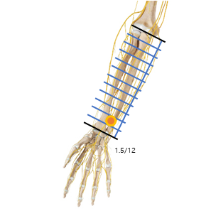통리 (HT5) : 아래팔 안쪽면, flexor carpi ulnaris tendon의 노뼈쪽, 손목주름 ~ 팔꿈치오금주름을 12로 할 때 손목주름에서 1/12인 지점. 0.3~0.5寸 (0.9~1.5 cm) 직자 / 0.5~1.0寸 (1.5~3.0 cm) 사자한다. 아래팔, 안쪽면, flexor carpi ulnaris tendon의 노뼈쪽, 손목주름 ~ 팔꿈치오금주름을 12로 할 때 손목주름에서 1/12인 지점에 취혈한다.