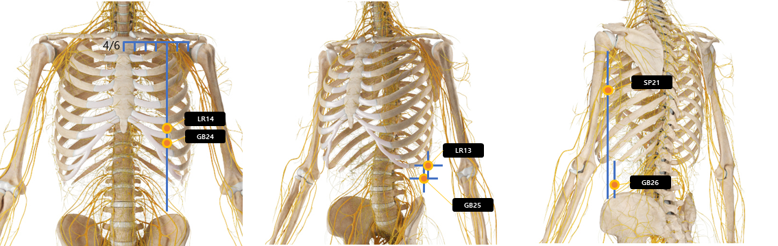 대포혈 SP21, 기문혈 LR14, 일월혈 GB24, 장문혈 LR13, 경문혈 GB25, 대맥혈 GB26