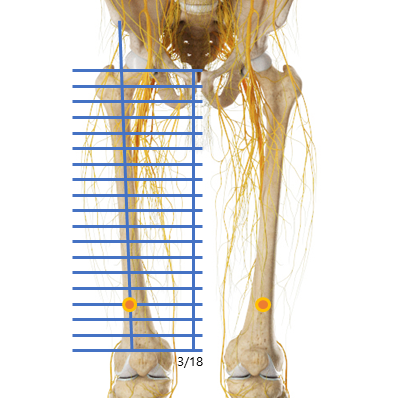 음시 (ST33) : 대퇴 외측, rectus femoris 가쪽, pubic symphysis ~ patella의 바닥의 끝을 18로 했을 때, patella의 바닥의 외측 끝에서 위쪽으로 3/18인 지점. 0.5~0.7寸 (1.5~2.1 cm) 직자 / 0.7~1.0寸 (2.1~3.0 cm) 사자한다. 대퇴 외측, rectus femoris 가쪽, pubic symphysis ~ patella의 바닥의 끝을 18로 했을 때, patella의 바닥의 외측 끝에서 위쪽으로 3/18인 지점.