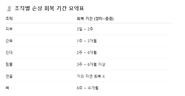 예를 들어 피부는 1주일이면 거의 회복되지만, 인대나 연골은 수개월이 걸릴 수 있어요.