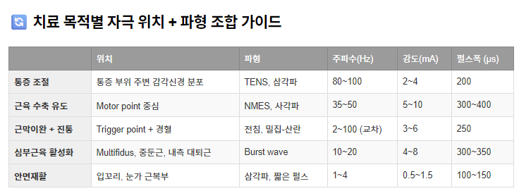 🔄 치료 목적별 자극 위치 + 파형 조합 가이드