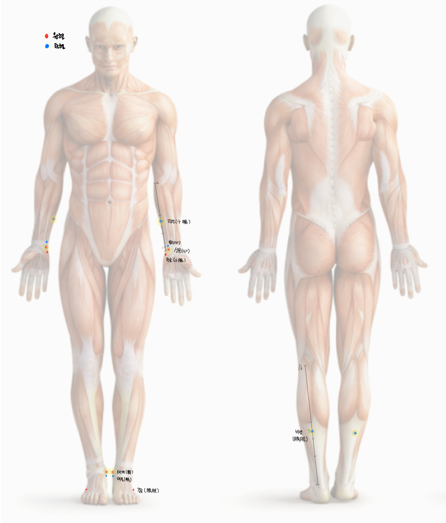 - 양지(三焦經 원혈) / 내관(心包經 락혈)