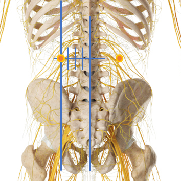 황문 (BL51) : 허리, 1번 요추 spinous process 아래모서리와 같은 높이, posterior median line에서 가쪽으로 3寸. 0.3~0.6寸 (0.9~1.8 cm) 직자 / 1.0~1.5寸 (3.0~4.5 cm) 사자한다. 1번 요추 spinous process 아래모서리를 찾고 같은 높이, posterior median line에서 가쪽으로 3寸에 취혈한다. *내부에 신장이 위치하고 있기에 깊게 자침하지 않는다.