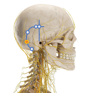 솔곡 (GB8) : 측두, auricular apex 수직 위쪽으로 1.5寸인 지점. 0.2~0.3寸 (0.6~0.9 cm) 직자 / 0.3~0.5寸 (0.9~1.5 cm) 사자한다. auricular apex 수직 위쪽, temporal hairline 위로 1.5寸 입을 닫는 움직임에서 측두근이 촉진된다.