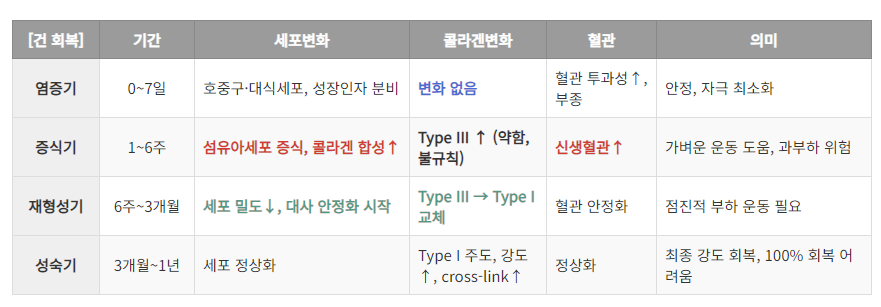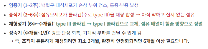 | 재형성기 | 6주~3개월 | 세포 밀도↓, 대사 안정화 시작 | Type III → Type I 교체 | 혈관 안정화 | 점진적 부하 운동 필요 |