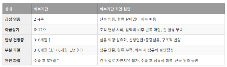 | 부분 파열 | 3~6개월 (소) / 6개월~1년 (대) | 섬유 단절, 혈류 부족, 회복 시 섬유화·불안정성 |