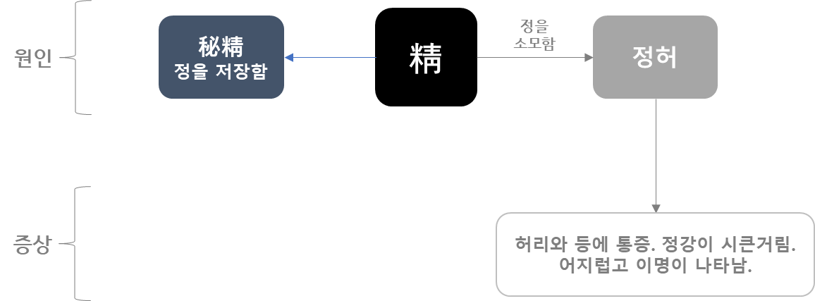 정허 - 허리와 등에 통증. 정강이 시큰거림. 어지럽고 이명이 나타남, 눈이 잘 안보임(가까운 것이 안 보임)
