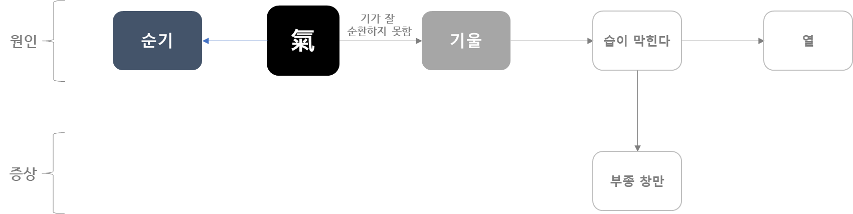 기 : 균형이 무너진 자세, 식이, 혈액순환, 호흡, 자극.