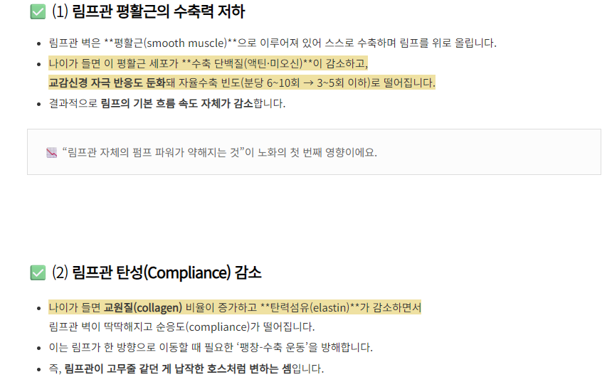 📉 “림프관 자체의 펌프 파워가 약해지는 것”이 노화의 첫 번째 영향이에요.